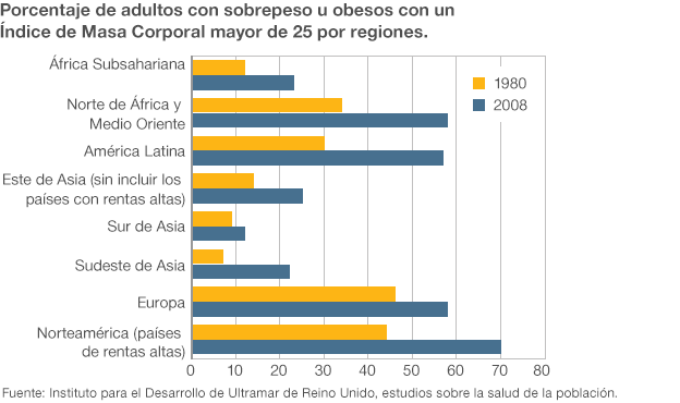 En la actualidad, una de cada tres personas en el mundo padece sobrepeso. El Instituto de Desarrollo de Ultramar calcula que hay mil millones de obesos y señala que el problema es mayor en los países de ingreso medio, donde cada vez se come más carne y otros alimentos ricos en grasas.