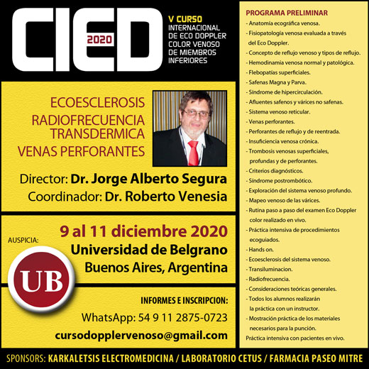 Debido a la situación generada por la pandemia, la organización del Curso Internacional de Eco Doppler color venoso de miembros inferiores decidió posponer la fecha prevista. Así, esta quinta edición 2020 se llevará a cabo los días 9, 10 y 11 de diciembre próximos.