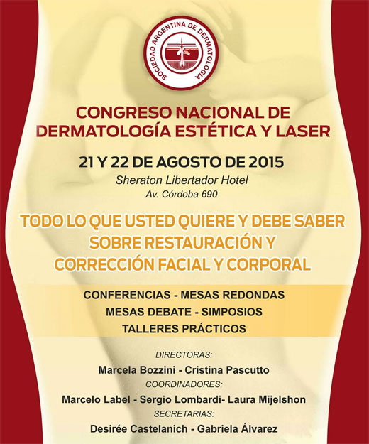 Bajo el título “Todo lo que usted quiere y debe saber sobre restauración facial y corporal", se llevará a cabo el Congreso Nacional de Dermatología Estética y Láser. Organizado por la Sociedad Argentina de Dermatología (SAD), el evento se realizará el 21 y 22 de agosto próximos en el Sheraton Libertador Hotel.